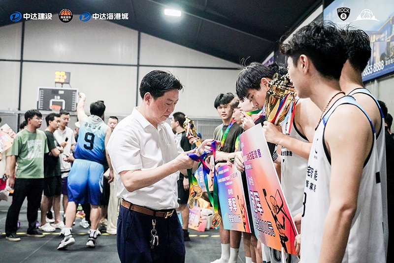 頒獎(jiǎng)典禮上,中達(dá)建設(shè)總經(jīng)理肖國(guó)生為獲獎(jiǎng)隊(duì)伍頒獎(jiǎng),肖總表示,生命在于運(yùn)動(dòng),生命需要運(yùn)動(dòng),運(yùn)動(dòng)是生命的源泉。歷時(shí)17天共計(jì)160場(chǎng)比賽,中達(dá)建設(shè)贊助本次籃球賽事旨在鼓勵(lì)全民健身,傳揚(yáng)奮進(jìn)、拼搏、團(tuán)結(jié)的運(yùn)動(dòng)精神,同時(shí)也為即將到來(lái)的亞運(yùn)會(huì)做好熱身,廣泛營(yíng)造全民迎亞運(yùn)的濃厚氛圍。