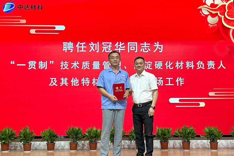 會議第三項,舉行“一貫制”質量管理項目啟動儀式。聘任材料專家劉冠華為“一貫制”質量管理、沉淀硬化材料負責人。中達材料要以工藝、技術規(guī)范“一貫制”為抓手;以培養(yǎng)員工習慣養(yǎng)成和行為規(guī)范為目的;在現(xiàn)有體制下,不斷提高質量管理水平,向管理要質量、出效益。