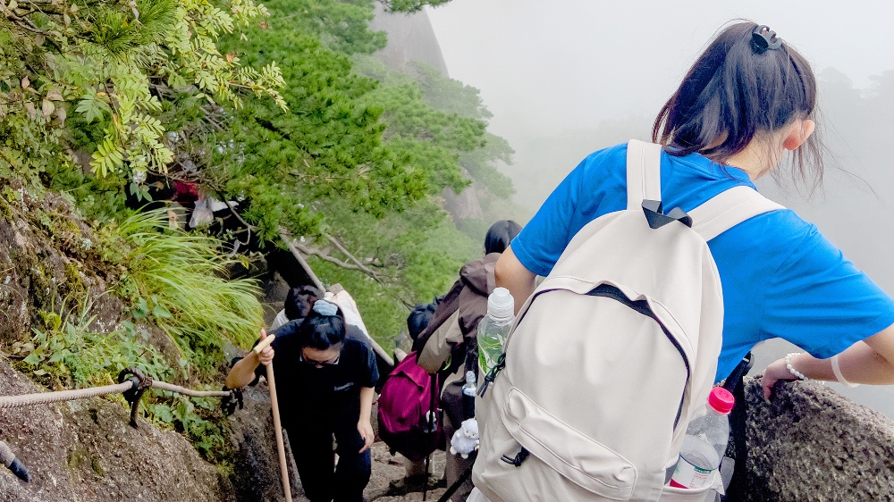 登山途中,大家都緊跟步伐、團(tuán)結(jié)協(xié)作,有的幫他人分擔(dān)行李、有的互相攙扶、有的負(fù)責(zé)尋找路線、有的加油打氣。明確的分工與默契的配合讓閃耀青年們共同翻過(guò)了“如入畫境,似幻而真”的始信峰,看到了形象的猴子觀海,也感受了被云海環(huán)繞的坐擁奇峰奇石的西海大峽谷;跨過(guò)重重阻礙,大部隊(duì)登上了第一天的目的地——光明頂。