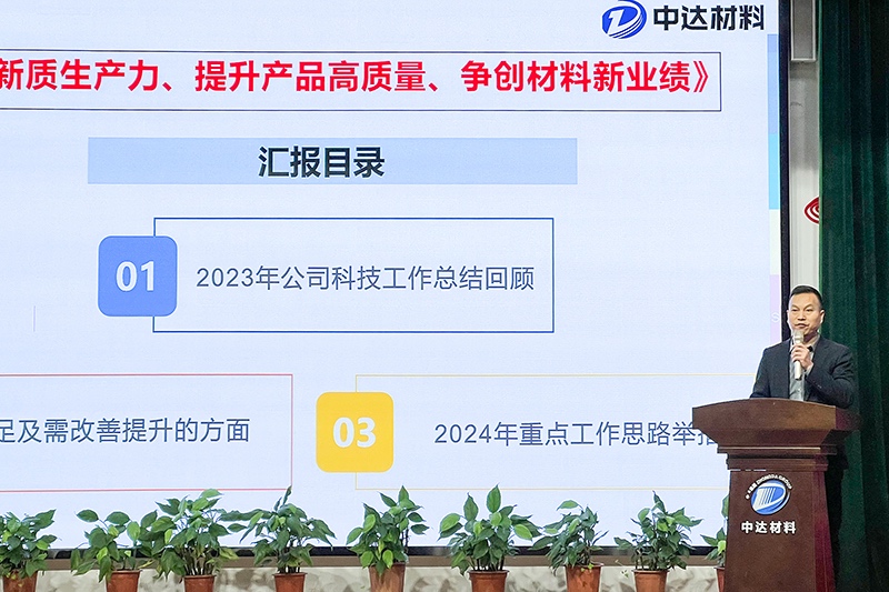 會上,中達材料副總經理夏亞金對2023年科技工作進行總結,并提出2024年工作思路與計劃。公司科技工作以重點項目、重點技術突破為主要方向,重抓內部生產管理,以一貫制技術質量管理為抓手,突出抓好“生產工藝創(chuàng)新”和“品質提質創(chuàng)新”兩大項目。以技術創(chuàng)新為引領推動技改創(chuàng)新、發(fā)明創(chuàng)新、管理創(chuàng)新深入開展,加快推進技術創(chuàng)新和數(shù)字化建設力度,促進生產制造高端化、智能化、綠色化發(fā)展,助力中達材料節(jié)能降本和提質增效有明顯提升。