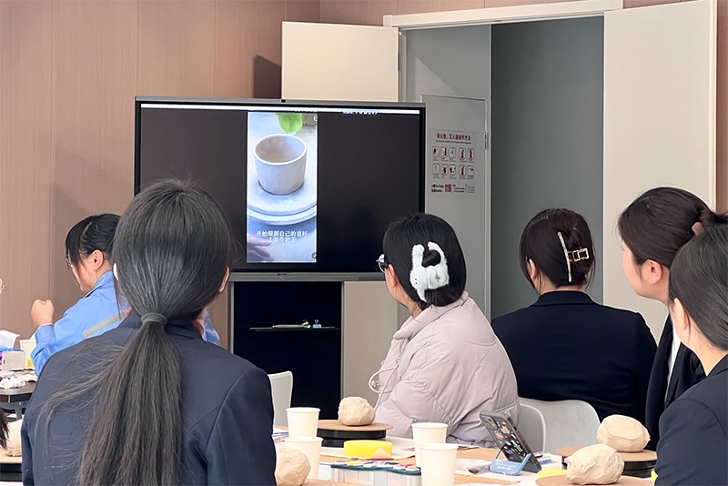 活動(dòng)開始,陶藝?yán)蠋熛茸尨蠹矣^看了簡(jiǎn)要的陶藝制作步驟視頻,再細(xì)致講解示范制作過程中的工藝及技巧。公司女工們認(rèn)真聆聽操作步驟和注意事項(xiàng),仔細(xì)觀摩操作細(xì)節(jié)。